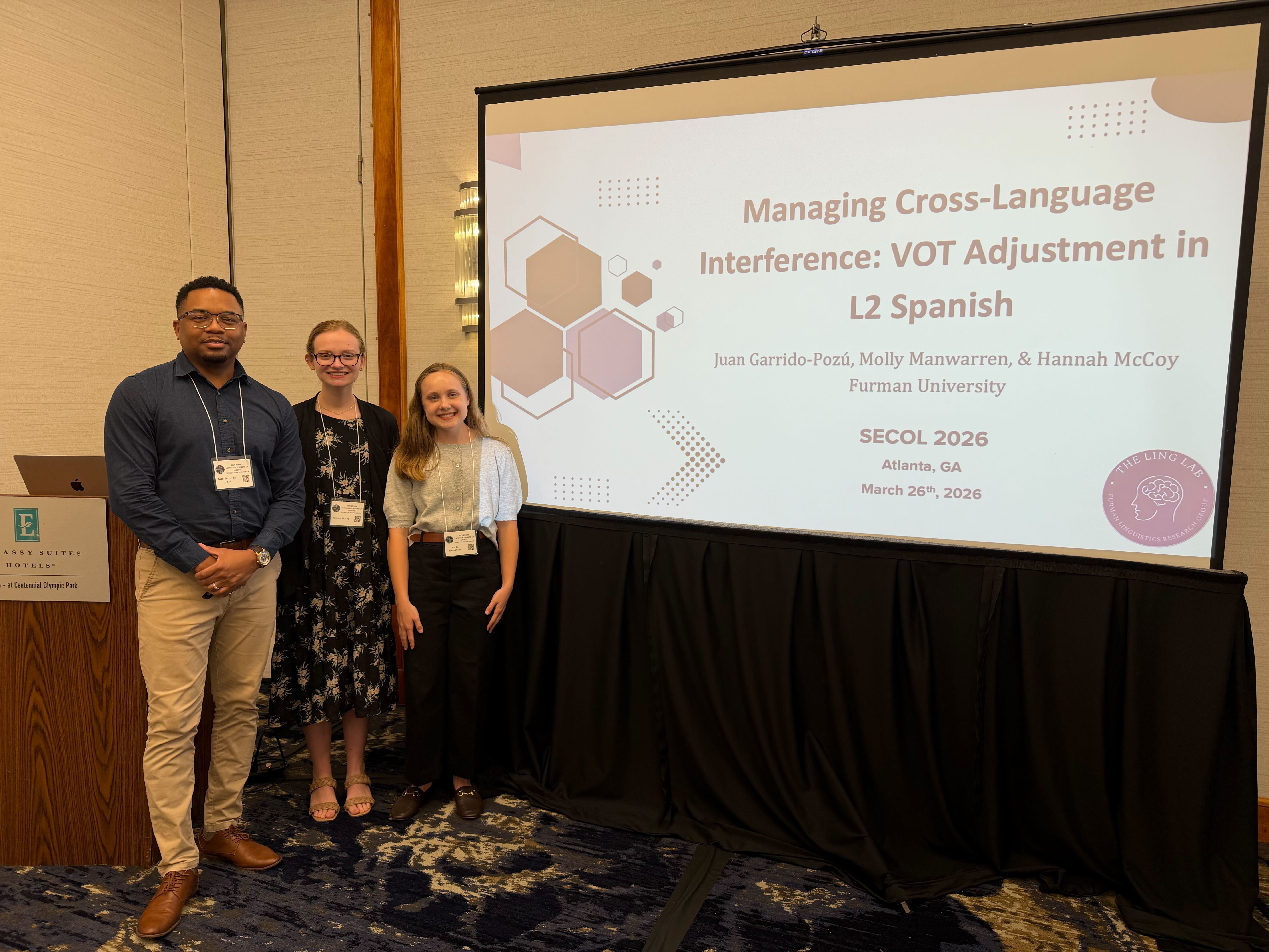 Dr. Garrido, Hannah McCoy, and Molly Manwarren presented the results of our lab project at the Southeastern Conference on Linguistics 2026, hosted by Georgia State University in Atlanta, GA. Our presentation sparked a great discussion on the effects of phonetic instruction on L2 pronunciation learning.